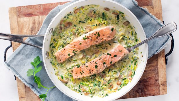 Heerlijk pannetje met een romig mengsel met prei en champignons met daarin stukjes zalmfilets gegaard