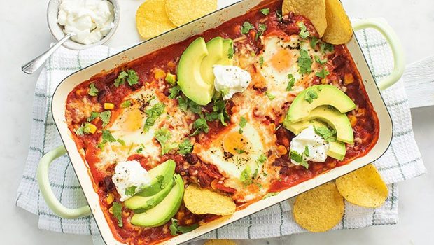 Heerlijke vegetarische ovenschotel met bonen, mais en eieren geserveerd met avocado en zure room