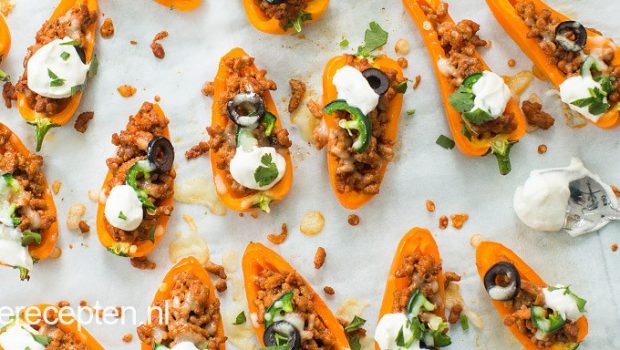 Lekkere snack van mini paprikaās gevuld met een kruidig gehaktmengsel en gegratineerd in de oven