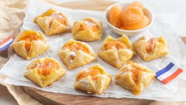 Lekkere oranje bladerdeeg gebakjes in de vorm van kroontje met custard en abrikoosjes.