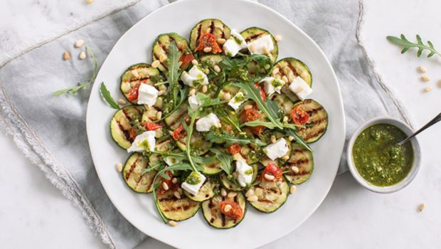 Heerlijk voorgerecht van courgette carpaccio met mozzarella, gedroogde tomaatjes en pesto. Een smaakvol en makkelijk te bereiden gerecht met gegrilde courgette plakjes. Dat ziet er toch leuk uit!