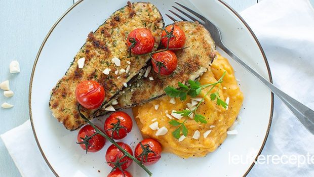 Vegetarisch recept voor schnitzels van plakken aubergine in een krokant jasje geserveerd met zoete aardappelpuree en tomaatjes