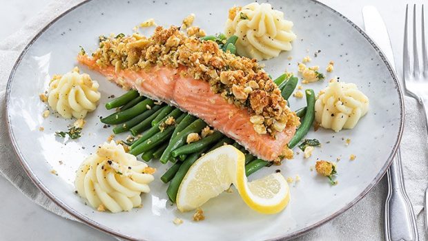 Heerlijke zalm met krokante en kruidige korst uit de oven met boontjes en puree, een heerlijk en makkelijke kerstrecept of voor tijdens een diner