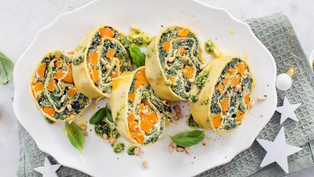 Een zelfgemaakte rollade van pasta gevuld met romige spinazie en pompoen geserveerd met pesto. Een heerlijk vegetarisch (kerst)gerecht!