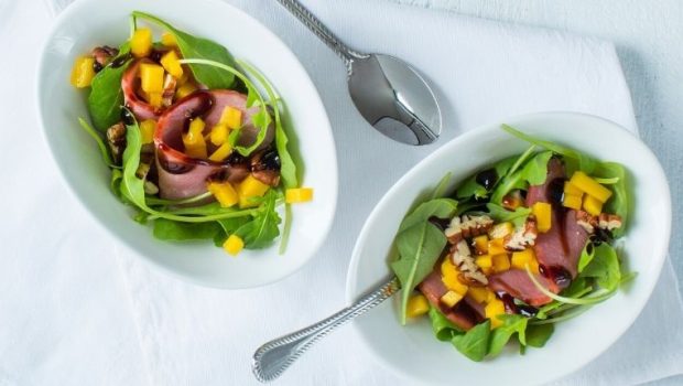 In 10 minuten maak je deze amuse voor de kerst van eendenborst, mango en balsamico