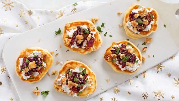 Feestelijke vegetarische hapjes van blini's met een topping van geitenkaas en gekarameliseerde rode ui, een perfecte combi!