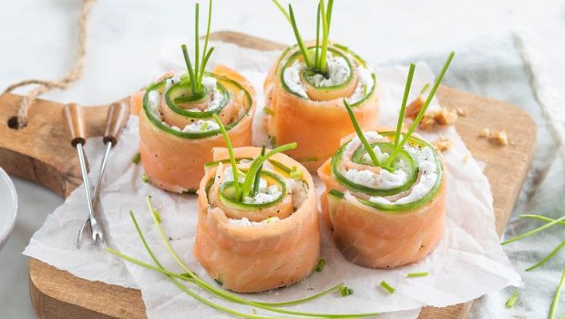 Lekker hapje van zalm met komkommer gevuld met een frisse roomkaasvulling en een crunch van walnoot.