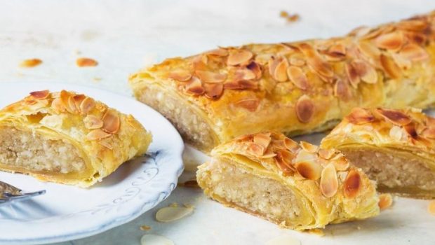 Gevulde banketstaaf met amandelspijs en een knapperige korst van bladerdeeg. Lekker met sinterklaas of de feestdagen