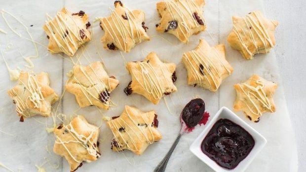 Voor een feestelijk kerstontbijt zijn deze scones in de vorm van sterren helemaal perfect. De vulling van cranberryās en de topping van witte chocolade maken de scones helemaal geschikt voor Kerst.