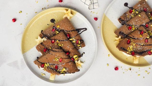 Een feestelijk ontbijt met deze chocolade kerstboom pannenkoeken. Leuk om samen aan tafel te versieren tijdens het kerstonbijt.
