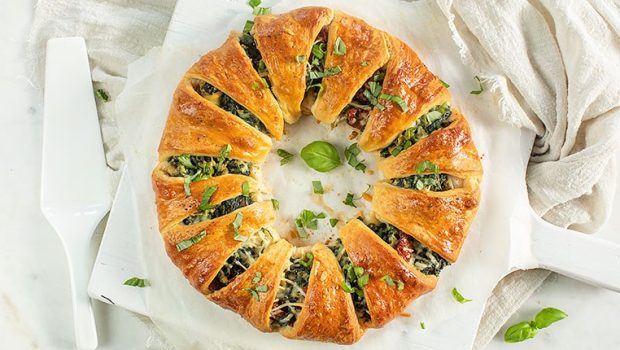 Lekker bij de Kerst of paasbrunch: knapperige krans gevuld met een mengsel van eieren en spinazie.