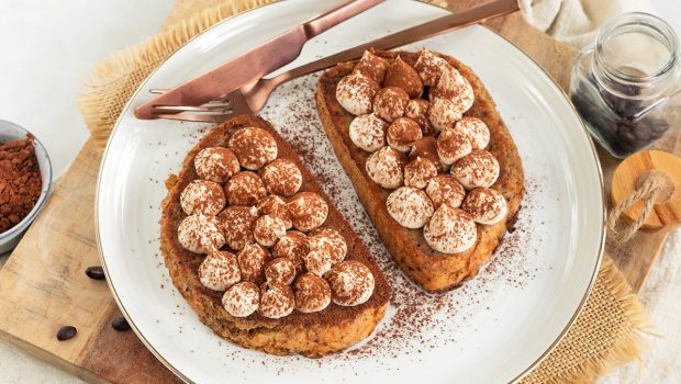 Deze tiramisu wentelteefjes moet je echt een keer proberen! De lichte koffiesmaak, de romige mascarpone topping en het laagje cacao zorgen ervoor dat het lijkt alsof je een hap tiramisu neemt.