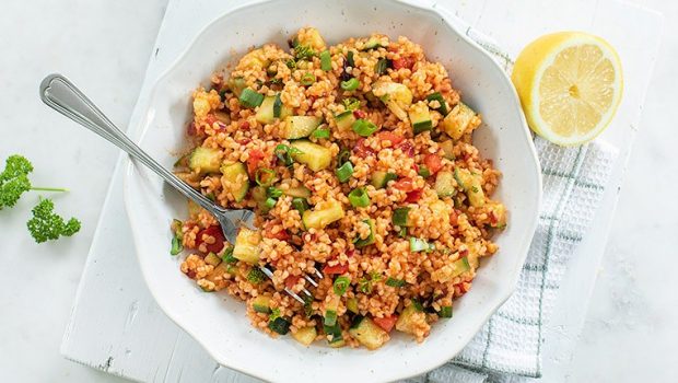 Deze frisse koude salade van bulgur met o.a. tomaat en komkommer, ook wel Kisir genoemd, is heerlijk op een warme dag of bij de BBQ