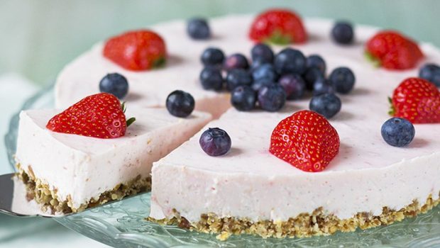 Deze healthy kwarkaart op basis van magere yoghurt is natuurlijk gezoet en heeft een lekkere bodem van o.a. havermout en noten