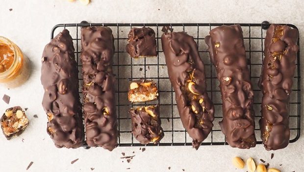 Zelfgemaakte, gezondere Snickers van dadels, pindakaas, pindaās en pure chocola. Verantwoord genieten!