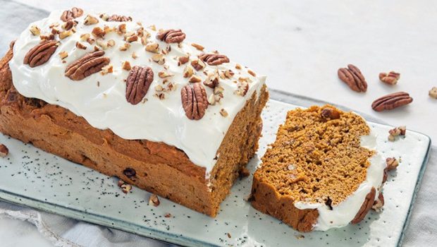 Gezonde en licht zoete pompoencake met speculaaskruiden, pecannoten en een frisse topping van kwark