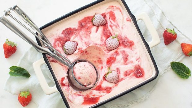 Zelfgemaakt romig ijs met verse aardbeien, slagroom en yoghurt. Makkelijk te maken zonder ijsmachine en heerlijk als dessert.