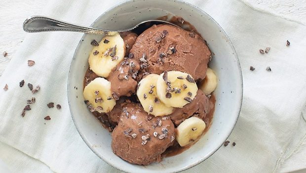 Lekker verantwoord genieten van dit zelfgemaakte chocolade ijs (zonder ijsmachine) op basis van banaan, cacao en een beetje pindakaas.