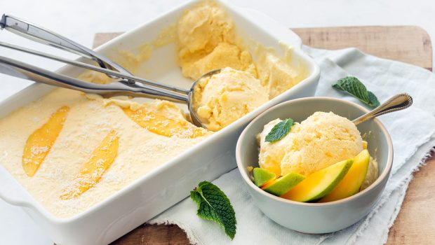 Heerlijk romig zelfgemaakt ijs (zonder ijsmachine) met de tropische smaken van mango en kokos. De perfecte combinatie van frisse zomerse maken samen in één ijssmaak.