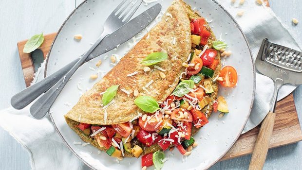Door pesto te mengen met eieren krijg je een heerlijke lichtgroene omelet die je kunt vullen met verschillende groenten. Vergeet niet te garneren met Parmezaanse kaas.