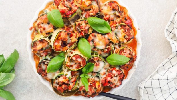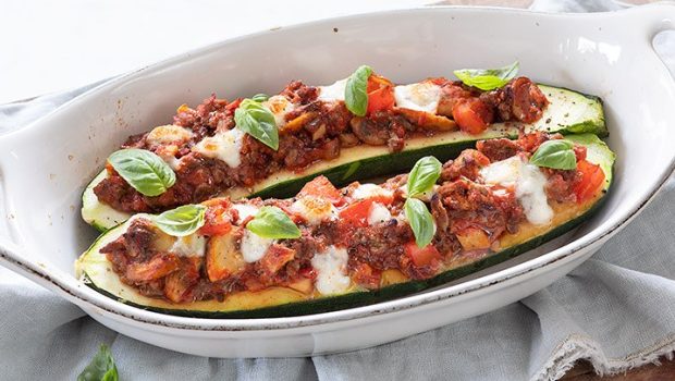 Gevulde courgette’s uit de oven met een Italiaans mengsel van gehakt, basilicum en mozzarella