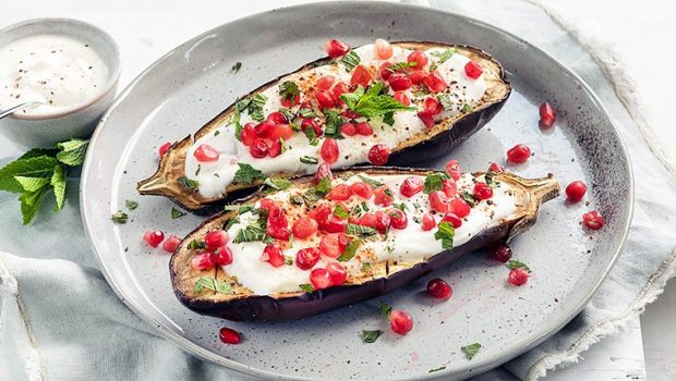 Heerlijke kruidige aubergines uit de oven geserveerd met frisse yoghurt en granaatappelpitjes