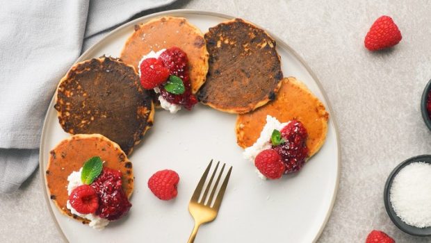 Deze lekkere luchtige pannenkoekjes zijn gemaakt op basis van amandelmeel en huttenkase, lekker en tevens koolhydraatarm en glutenvrij!
