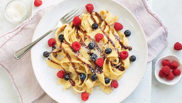 Is het een bord pasta? Zijn het pannenkoeken? Het zijn beide! Serveer je pannenkoeken eens op deze manier en kinderen zullen er extra van smullen!