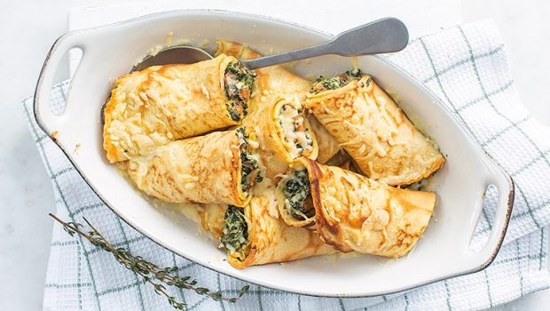 Goed gevulde pannenkoekrolletjes met romige spinazie en champignons gegratineerd uit de oven