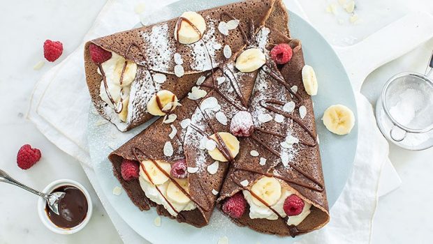 Lekkere chocolade pannenkoeken gemaakt met chocolademelk, gevuld met room, banaan en, je raadt het nooit, nog meer chocolade.