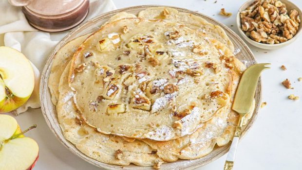 Lekker recept voor vegan pannenkoeken die je in 20 minuutjes op tafel hebt staan. De typische Hollandse pannenkoeken met appel en rozijnen voor het hele gezin. 100% plantaardig en je hebt ze in een mum van tijd gemaakt.