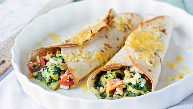 Krokant gegratineerde wraps met een romige vulling van spinazie, kip en tomaatjes. Een super snelle en makkelijke maaltijd waar iedereen van smult en weer eens iets anders is dan een standaard mexicaanse vulling.