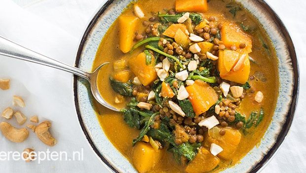 Gezonde curry met pompoen en linzen die makkelijk te maken is en tevens helemaal vegan is!