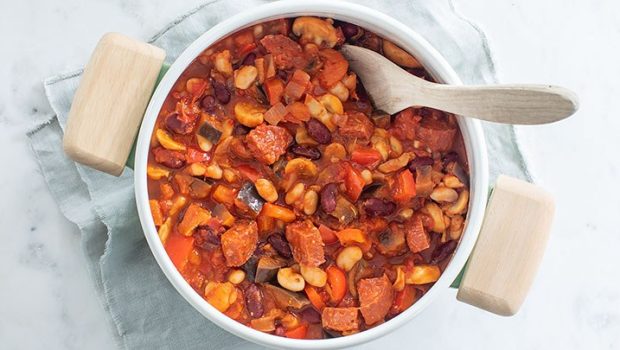 Deze voedzame stoofschotel heeft een lekkere licht pittige Spaanse smaak door de chorizo en combineert perfect bij de witte bonen en kidneybonen.