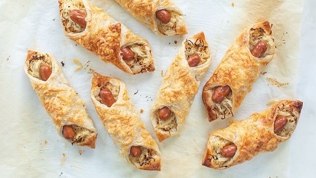Knakworstjes en zuurkool zijn een heerlijke combinatie, zeker verpakt in deze knapperige bladerdeegbroodjes afgemaakt met kaas