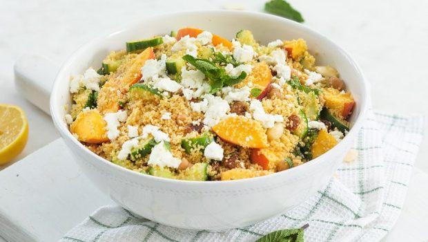 Lekker salade als lunch of bij de BBQ van couscous met munt, perzik en komkommer. Lekker zomers en fris en zoet van smaak.