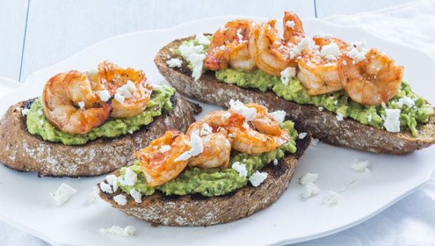 Heerlijke gemarineerde garnalen met chilipeper van de Big Green Egg BBQ met een romige guacamole op een knapperig broodje.