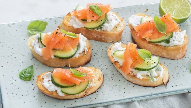 Krokante gegrilde ciabatta brood met een frisse topping van roomkaas, komkommer en zalm. Lekker bij de borrel.