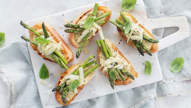 Krokante bruschetta's met gegrilde groene asperges op een laagje roomkaas met pesto. Extra lekker met wat extra Parmezaanse kaas en verse basilicum.