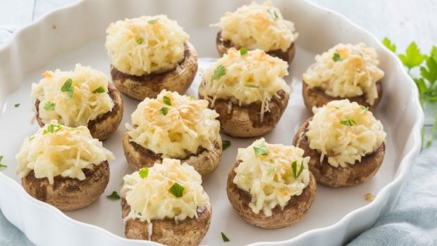 Een heerlijk vegetarisch hapje uit de oven van gevulde champignons met risotto met truffelsmaak.