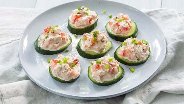 Met dit recept heb je snel een lekker hapje van plakjes komkommer met zelfgemaakte tonijnsalade op tafel