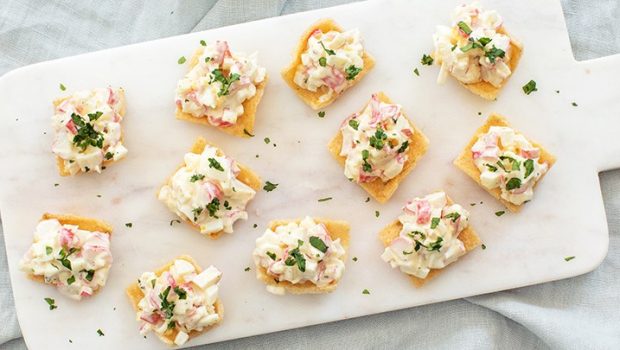 Een lekker hartig hapje van zelfgemaakte krabsalade met surimi en ei geserveerd op een stukje knapperige kroepoek.