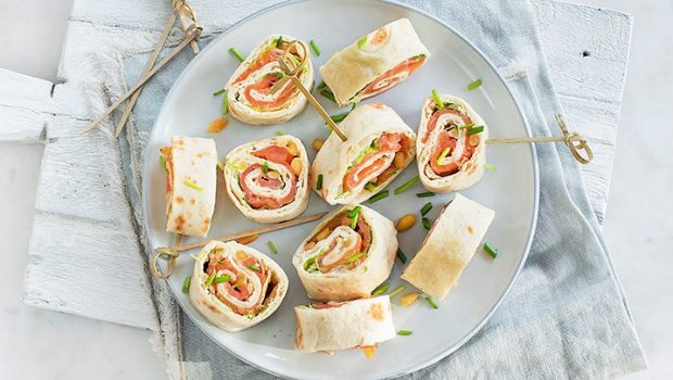 Heerlijk en makkelijk hapje van tortilla wrap rolletjes met zalm, kruidenroomkaas en sla, lekker bij de borrel of high tea