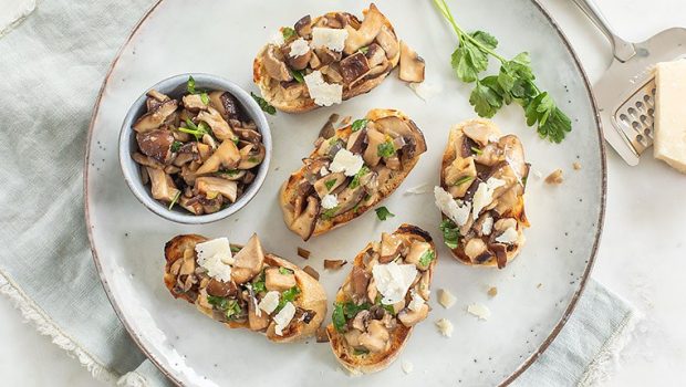 Krokante broodjes met een lekkere topping van gebakken paddenstoelen met Parmezaanse kaas