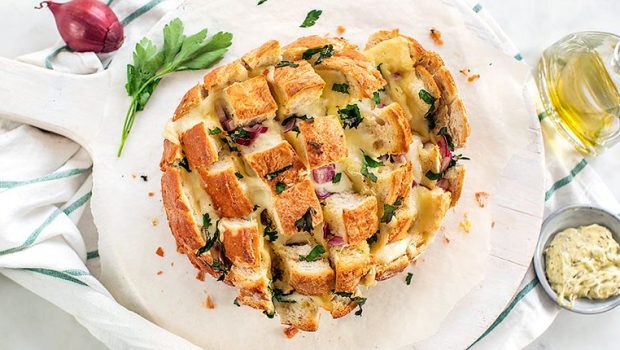 Gezellig voor bij de borrel om te delen; een plukbrood gevuld met kaas, kruidenboter en ui. En als je er een stukje uittrekt is hij extra cheesy door de mozzarellaāÆāÆ
