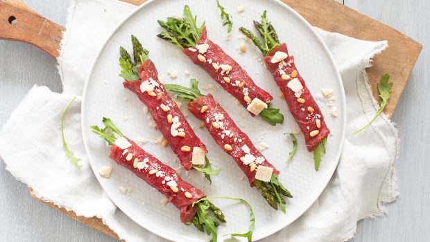 Deze carpaccio rolletjes zijn heel lekker als licht voorgerecht. Of als borrelhapje, want je kunt ze makkelijk van tevoren maken. Ik gebruik truffelmayonaise voor wat extra smaak, dat past goed bij de gegrilde asperges. De combinatie met rucola en Parmezaanse kaas maakt het helemaal af. Je hebt er niet veel voor nodig, en je bent maar maximaal 20 minuten bezig. Feestelijk bij het kerstdiner of bij een uitgebreid diner.