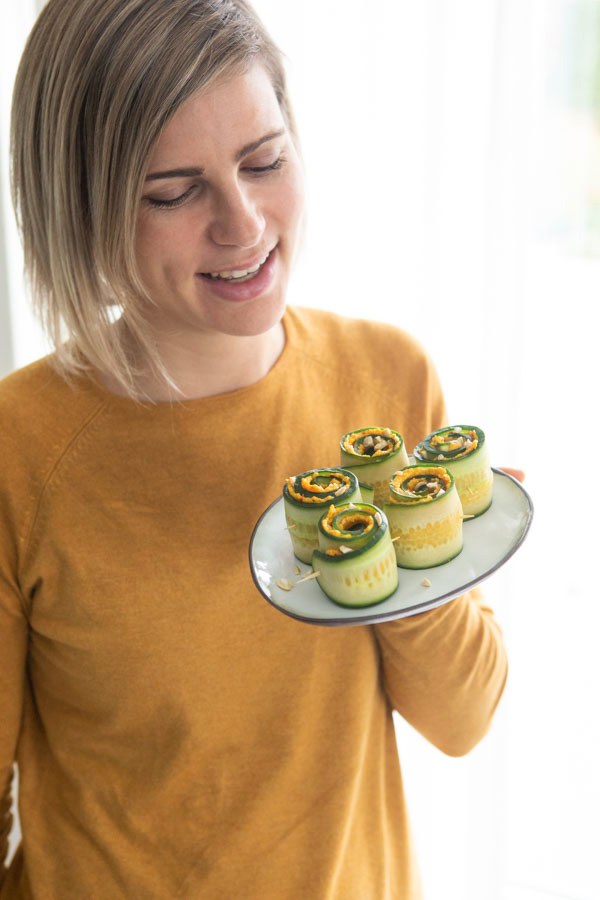 En last but not least maakte ik komkommer rolletje met de vegetarische Crème Oriëntaals Gekruid. Deze kruidige Oosterse spread is licht pittig en ligt qua smaak het dichts bij curry. Ook deze spread is ook op basis van Valess en bovendien rijk aan ijzer. Samen met de crunchy cashewnoten heb je een heerlijke vulling voor de komkommerrolletjes.