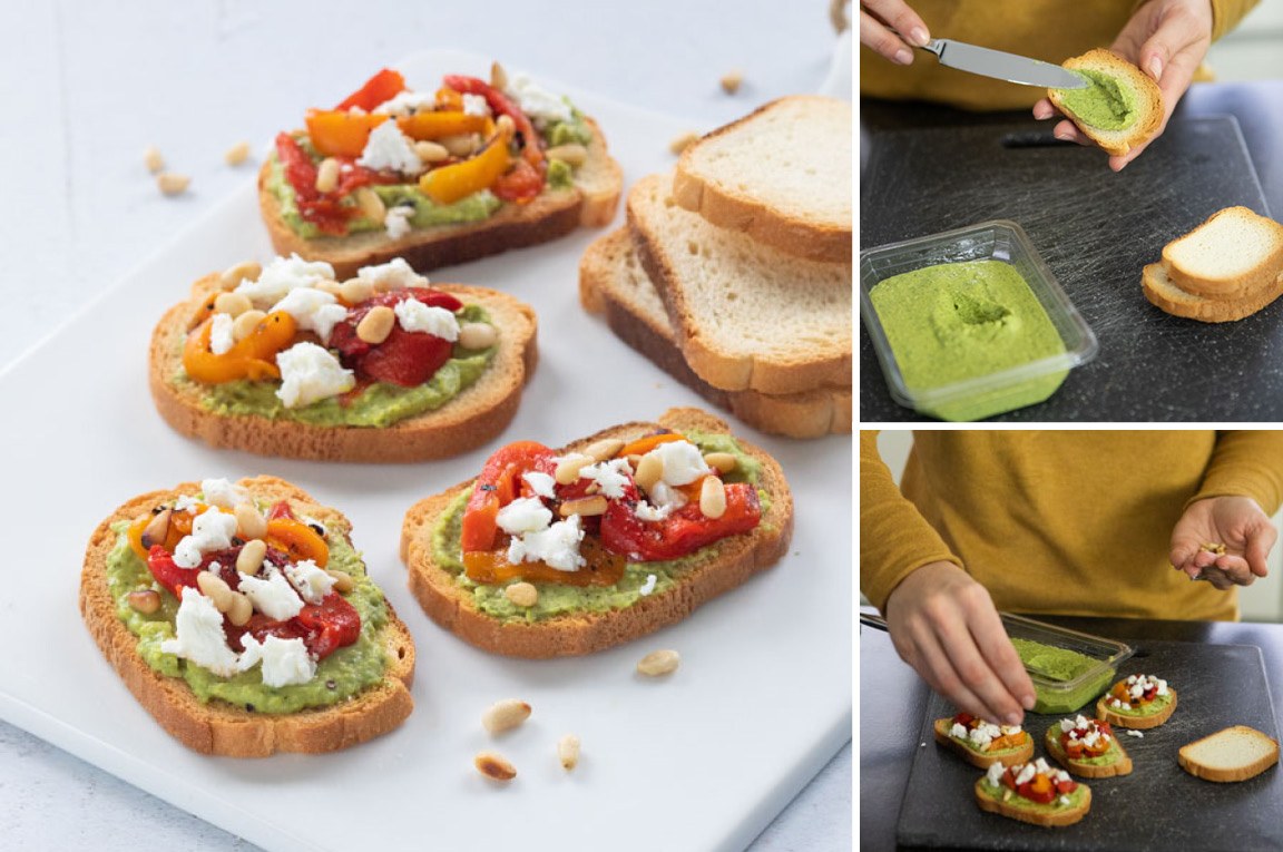 Besmeer de toastjes met de Greens Velderwten. Leg er een paar reepjes gegrilde paprika op en kruimel de feta er over. Bestrooi met de pijnboompitten en snufje zwarte peper. Serveer de toastjes direct.