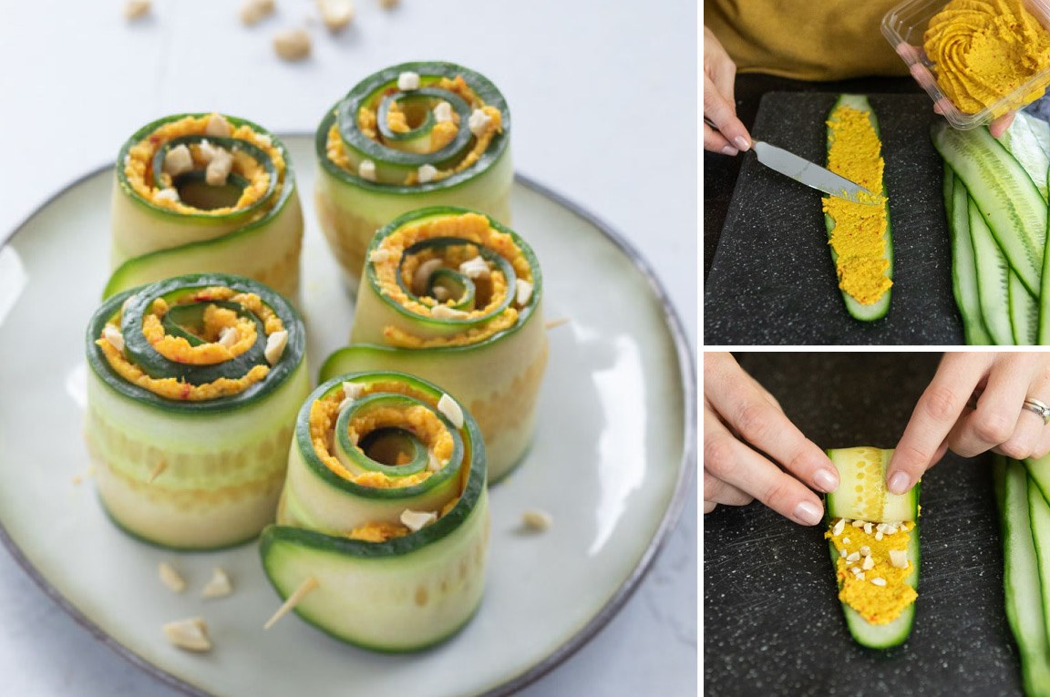 Snijd de komkommer in dunne plakken met de mandoline of kaasschaaf. Dep deze iets droog met een keukenpapiertje. Besmeer de plakken met de Crème Oriëntaals gekruid en bestrooi met wat fijngehakte cashewnoten. Rol de komkommerrolletjes voorzichtig op en steek er een prikkertje door. Bestrooi eventueel nog wat extra cashewnoten over de rolletjes voor het serveren. Dit hapje kun je max 2 dagen in de koelkast bewaren.