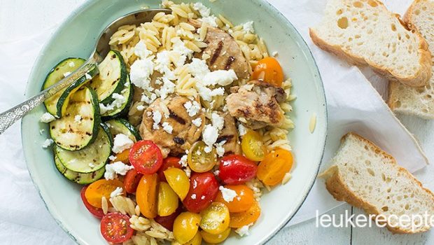 Deze pasta in de vorm van rijst is lekker licht en smaakt heerlijk met deze gegrilde kip en courgette.